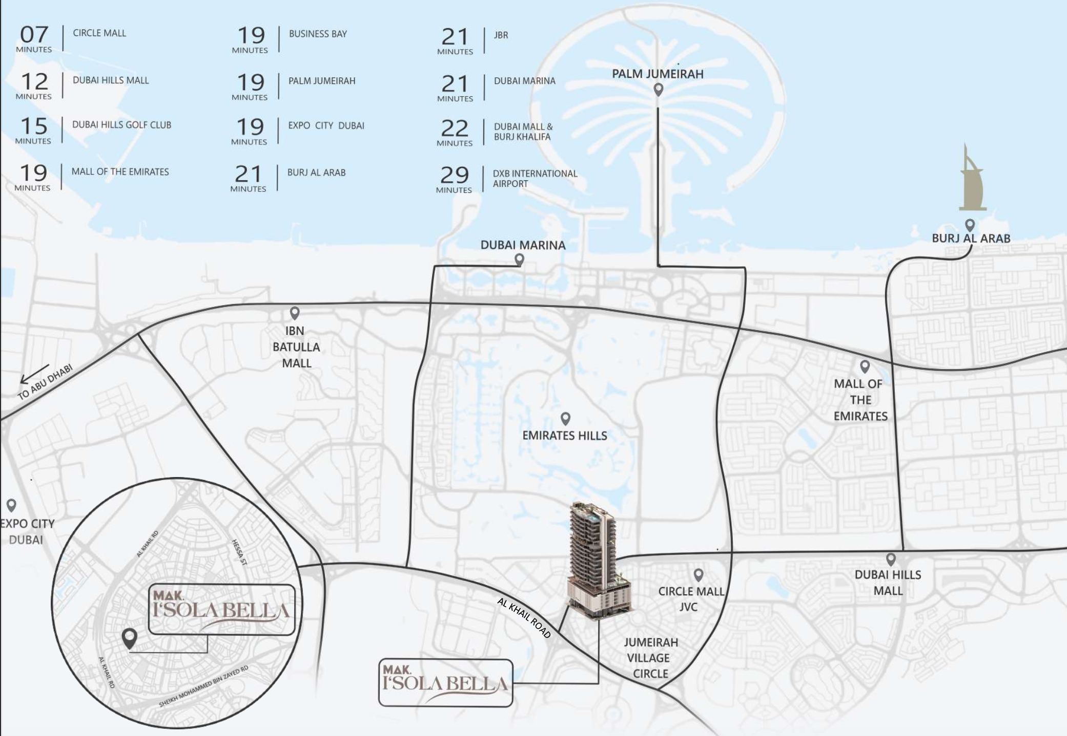Nestled within the thriving core of JVC, the project boasts exceptional connectivity, granting effortless access to Dubai's most prominent destinations via the adjacent Al Khail Road. JVC itself stands as a beacon of growth in Dubai's real estate landscape, consistently demonstrating high transactional volumes and robust capital appreciation potential. This makes Mak I'Sola Bella an astute choice for both discerning homebuyers seeking sophisticated comfort and investors targeting promising returns, all within easy reach of the city's bustling commercial districts, entertainment hubs, and cultural landmarks.