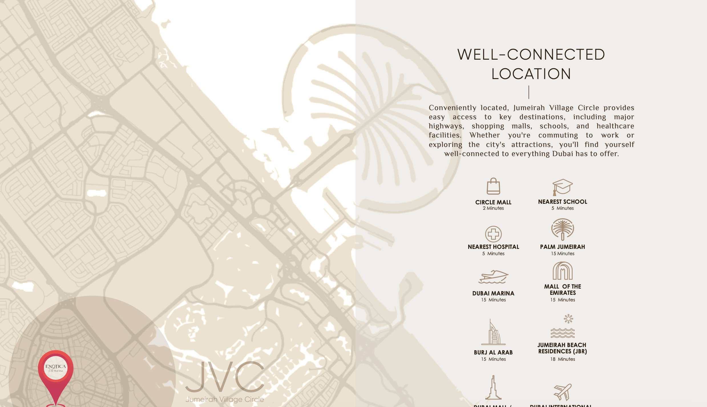 Strategically positioned within one of Dubai's most sought-after and family-centric districts, this development offers residents the unique advantage of tranquil park vistas while ensuring effortless access to the emirate’s central hubs. JVC is celebrated for its harmonious fusion of urban convenience and serene community ambiance, presenting an ideal environment for those pursuing a balanced lifestyle. Key business centers, world-class leisure attractions, and essential daily services are merely a short drive away, cementing Exotica's status as a nexus of connectivity and peaceful retreat.