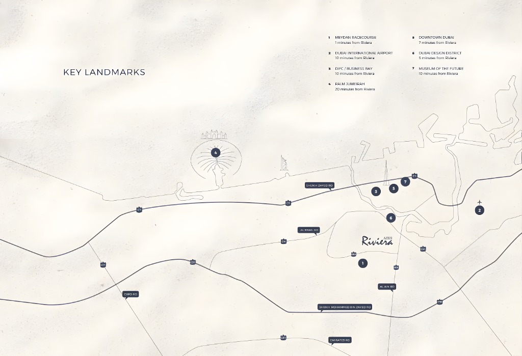 Nestled within the renowned AZIZI Riviera master community, the project boasts an enviable location providing effortless access across Dubai. Major arterial routes such as Al Ain – Dubai Road (E66) and Ras Al Khor Road (E44) are mere moments away, connecting you swiftly to the city’s bustling business hubs, world-class entertainment, and cultural landmarks. The iconic Burj Khalifa is just a 15-minute drive, while the luxurious Palm Jumeirah is reachable in 17 minutes, and Dubai International Airport in approximately 20 minutes. Moreover, the dynamic Meydan One precinct, with its extensive array of retail, gourmet dining, and leisure facilities, is virtually at your doorstep, blending urban excitement with residential tranquility.