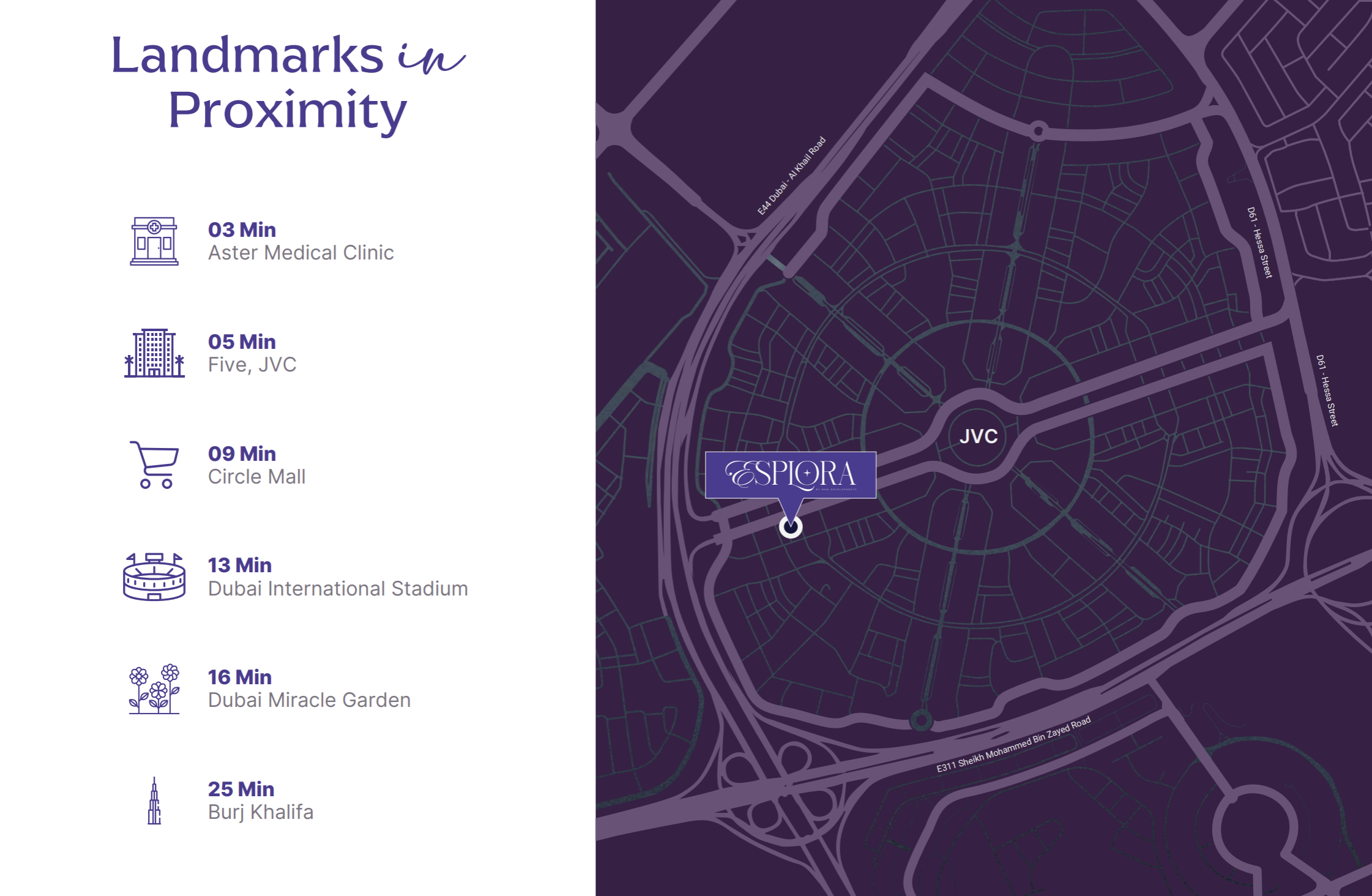 Positioned at the nexus of connectivity and community, this development offers residents the best of both worlds. While enjoying the serene atmosphere of a well-established neighborhood, effortless access to Dubai’s key attractions is guaranteed. Major business and leisure hubs like Downtown Dubai and Business Bay are a mere 25-minute drive. For daily necessities and leisure, Circle Mall and the verdant JVC Community Park are just a short walk away. The area is also home to a selection of esteemed nurseries, schools, and sports facilities, making it an ideal choice for families.
