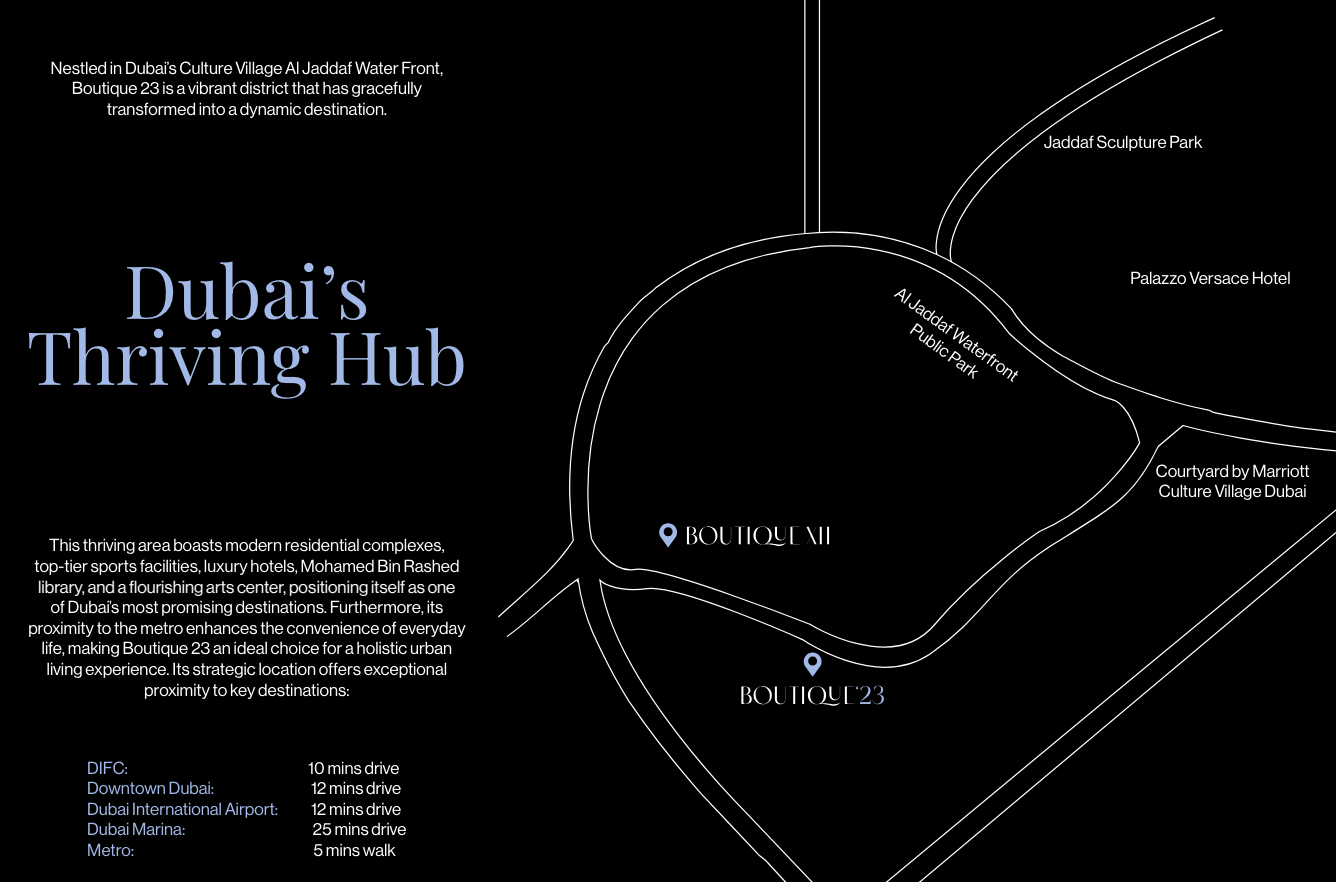 Gracing the skyline of Al Jaddaf, the development enjoys a prime locale renowned for its burgeoning artistic scene and unparalleled connectivity. Residents benefit from unrivalled access to key transport networks, including the Dubai Metro and major highways, facilitating seamless commutes across the city and to Dubai International Airport. The vibrant neighbourhood invites exploration, with cultural gems like the Ras Al Khor Wildlife Sanctuary, Dubai Cultural Village, and Jameel Arts Center just moments away, offering a harmonious blend of natural beauty and artistic inspiration.