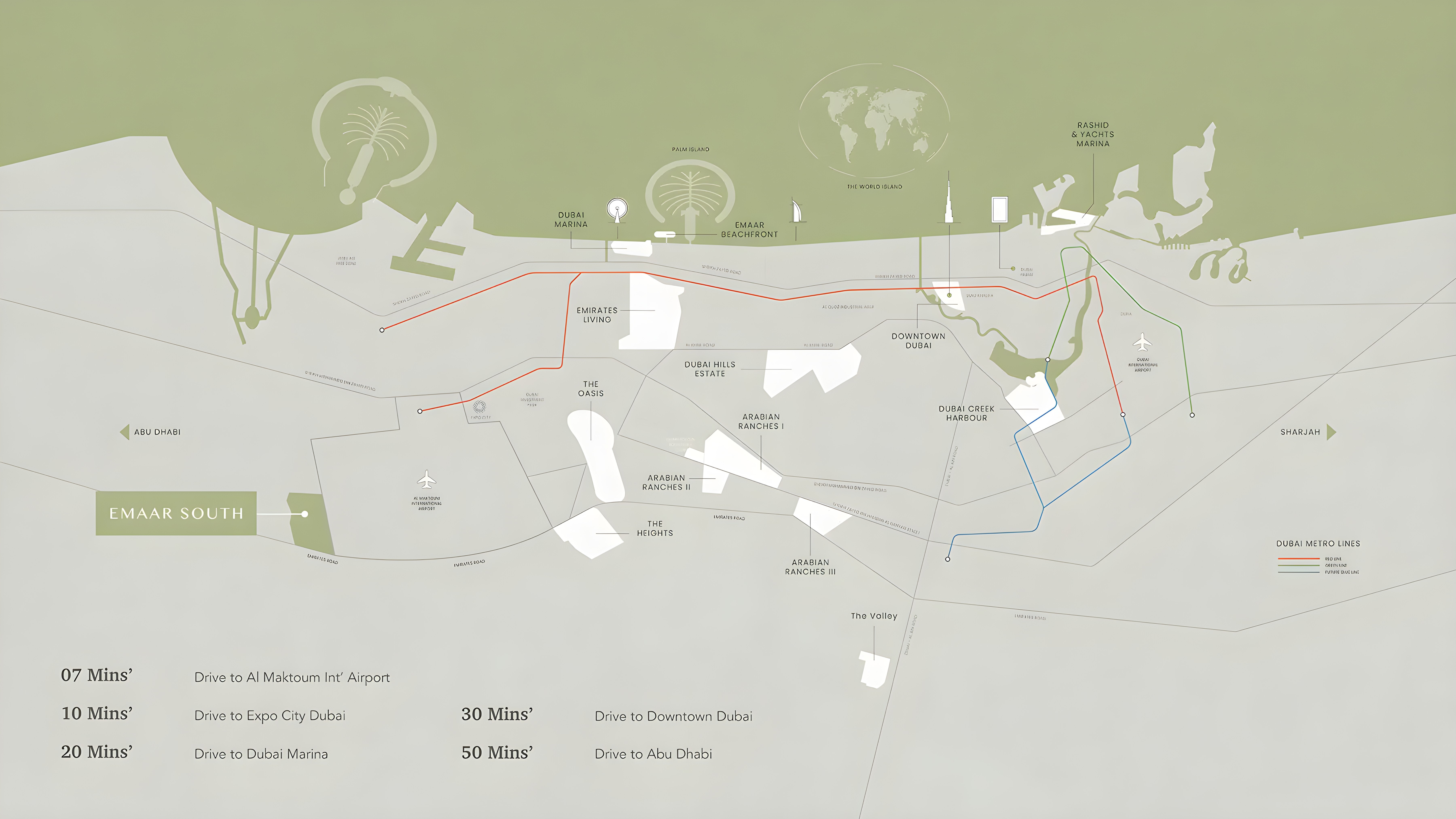 Located within the dynamic Dubai South district, this development offers residents an exceptional locational advantage and seamless access across the emirate. Its prime position places you mere minutes from Al Maktoum International Airport (DWC), a rapidly expanding global aviation hub. Effortless commutes are assured via major arterial routes like Sheikh Mohammed Bin Zayed Road (E311) and Emirates Road (E611). Proximity to the transformative Expo City Dubai site, the bustling Jebel Ali Port, and Dubai’s central business and leisure destinations makes this address highly desirable for families and professionals seeking a future-proof investment.