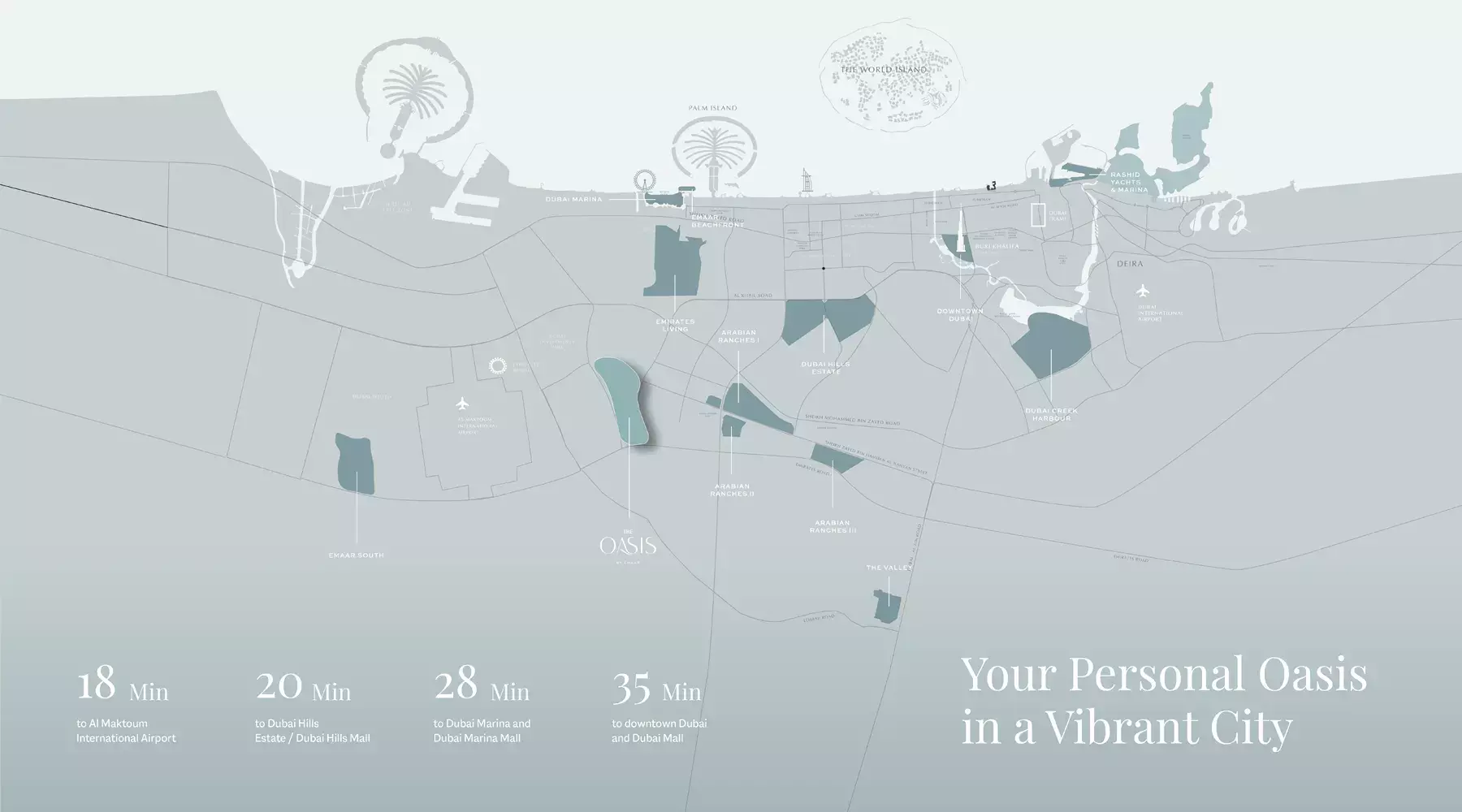 Strategically positioned, this community offers residents seamless connectivity across the emirate. Enjoy swift access to Dubai's major road networks, facilitating effortless commutes to bustling business hubs, world-class leisure destinations, and iconic landmarks. The Oasis itself is envisioned as a serene haven, blending tranquil landscapes with the conveniences of urban life, making it a perfect setting for families desiring both peace and accessibility.