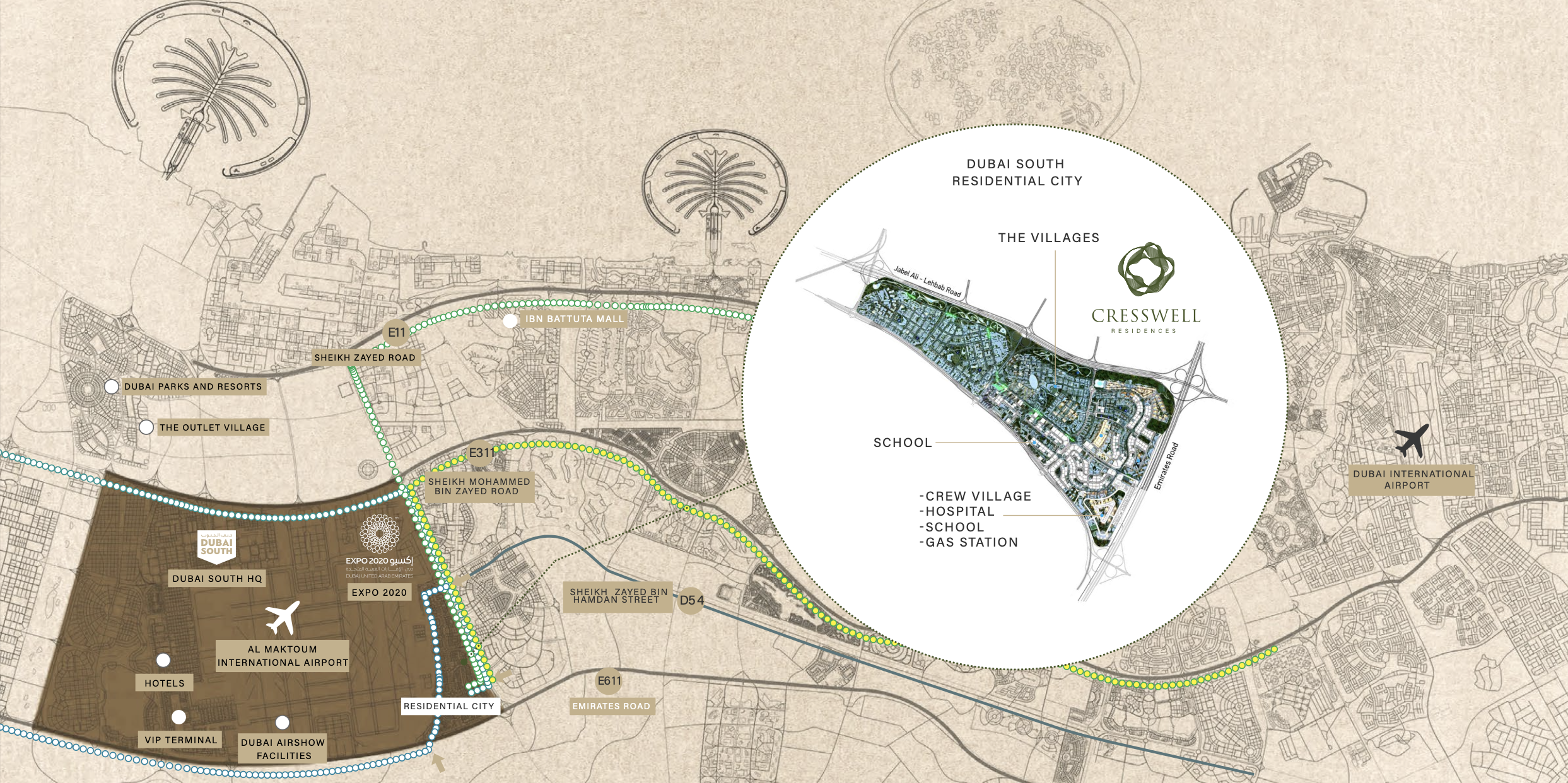 Situated within the strategic heart of Dubai South, this development boasts unparalleled access to key infrastructure. Commuters will appreciate the effortless links to major arteries such as Al Khail Road and Emirates Road, ensuring smooth journeys across the city. The vibrant surroundings are brimming with top-tier educational institutions, cutting-edge medical services, and an extensive selection of leisure, dining, and shopping destinations. While offering supreme urban convenience, the design also thoughtfully incorporates green spaces, providing a peaceful escape from the city’s pulse.