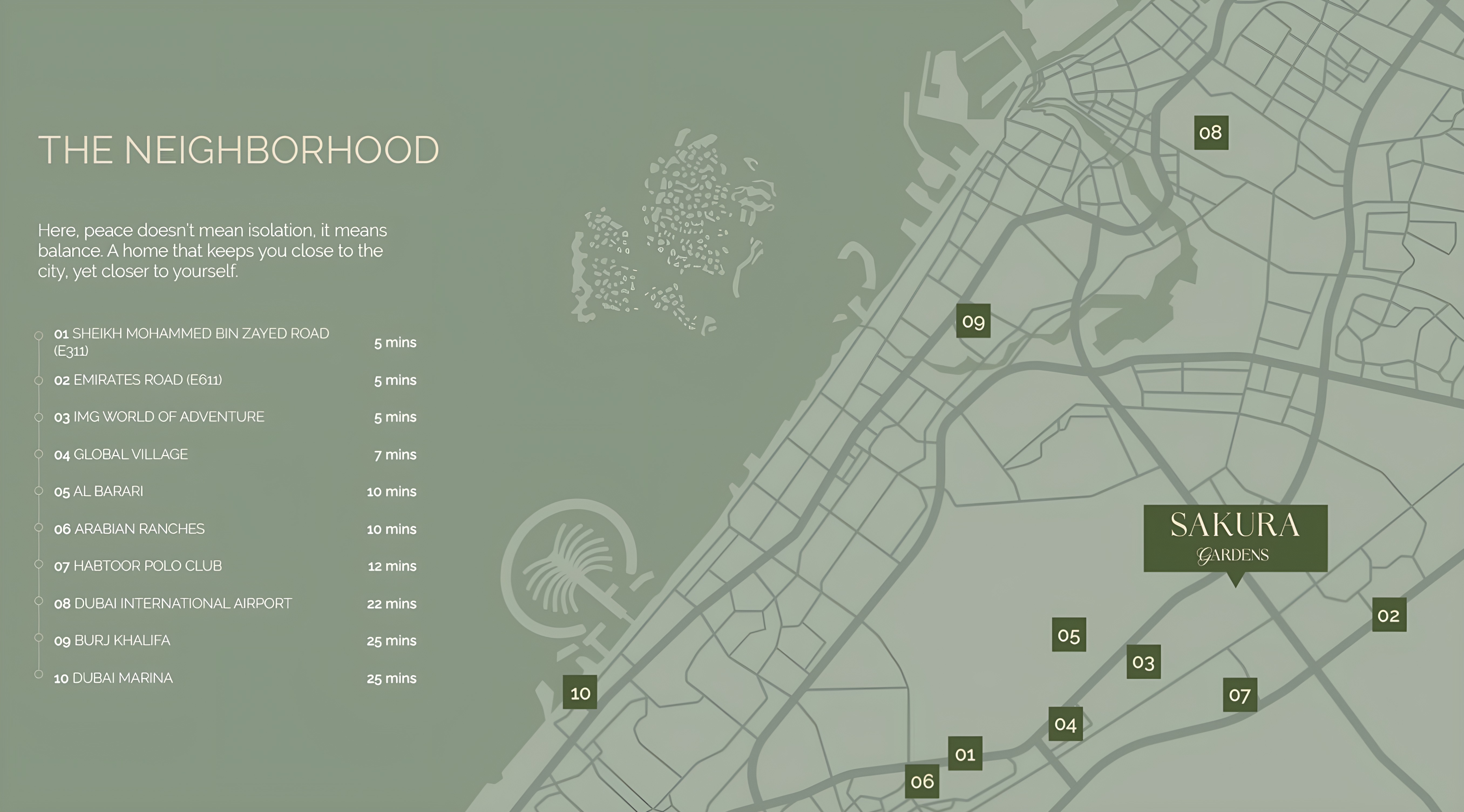 Nestled within the esteemed Falcon City of Wonders, a new standard of tranquil living emerges with Sakura Gardens, a signature development by HRE Development. This exceptional community offers an unparalleled blend of serene retreat and urban convenience, making it an astute choice for those seeking both a peaceful home and a promising investment. Its prime situation on Dubai–Al Ain Road ensures effortless connections to the city’s major business districts, entertainment hubs, and essential services, all while cultivating an environment deeply connected to nature's calm.