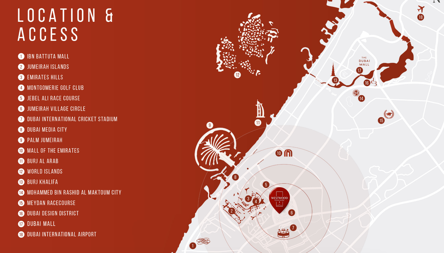 Nestled in JVC, a highly sought-after neighbourhood, Westwood Grande Phase 2 boasts an enviable position that ensures seamless connectivity across the emirate. Residents will benefit from swift access to Dubai's prominent destinations, including the retail paradise of Mall of the Emirates, the vibrant dining and entertainment hub of Dubai Marina, and the pristine beaches of Jumeirah Beach Residence (JBR). Furthermore, its proximity to reputable schools and international educational institutions makes it an optimal choice for families seeking convenience and quality education.
