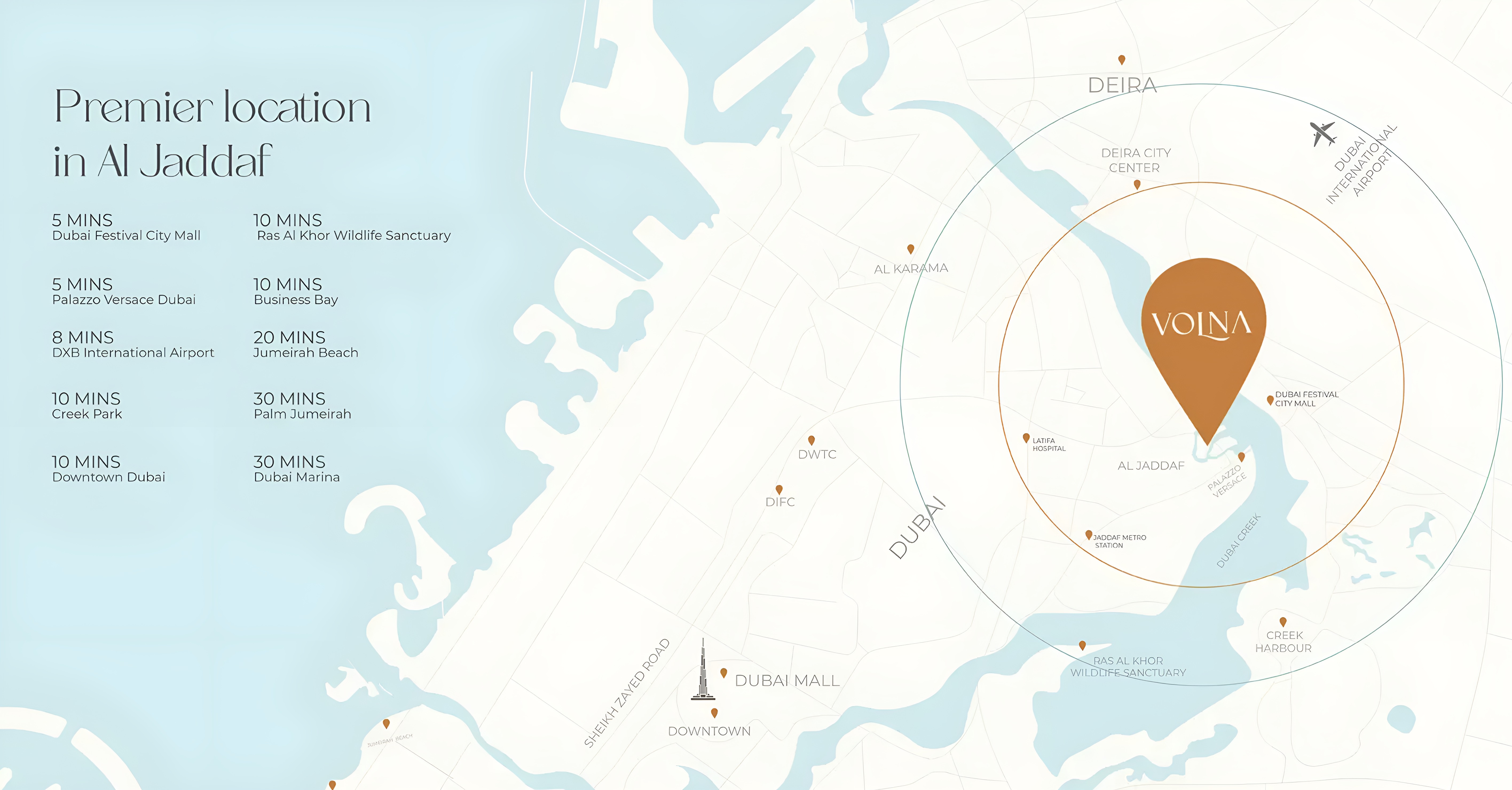Nestled gracefully along the serene shorelines of Culture Village, residents of Volna benefit from exceptional access to Dubai’s most celebrated destinations. The iconic Burj Al Arab is merely a 25-minute drive away, while the lively atmosphere of JBR Walk and its extensive leisure options can be reached in approximately 30 minutes. Its central positioning ensures seamless connections to Dubai’s bustling business districts and vibrant leisure attractions, striking a perfect balance between urban convenience and tranquil waterside serenity.