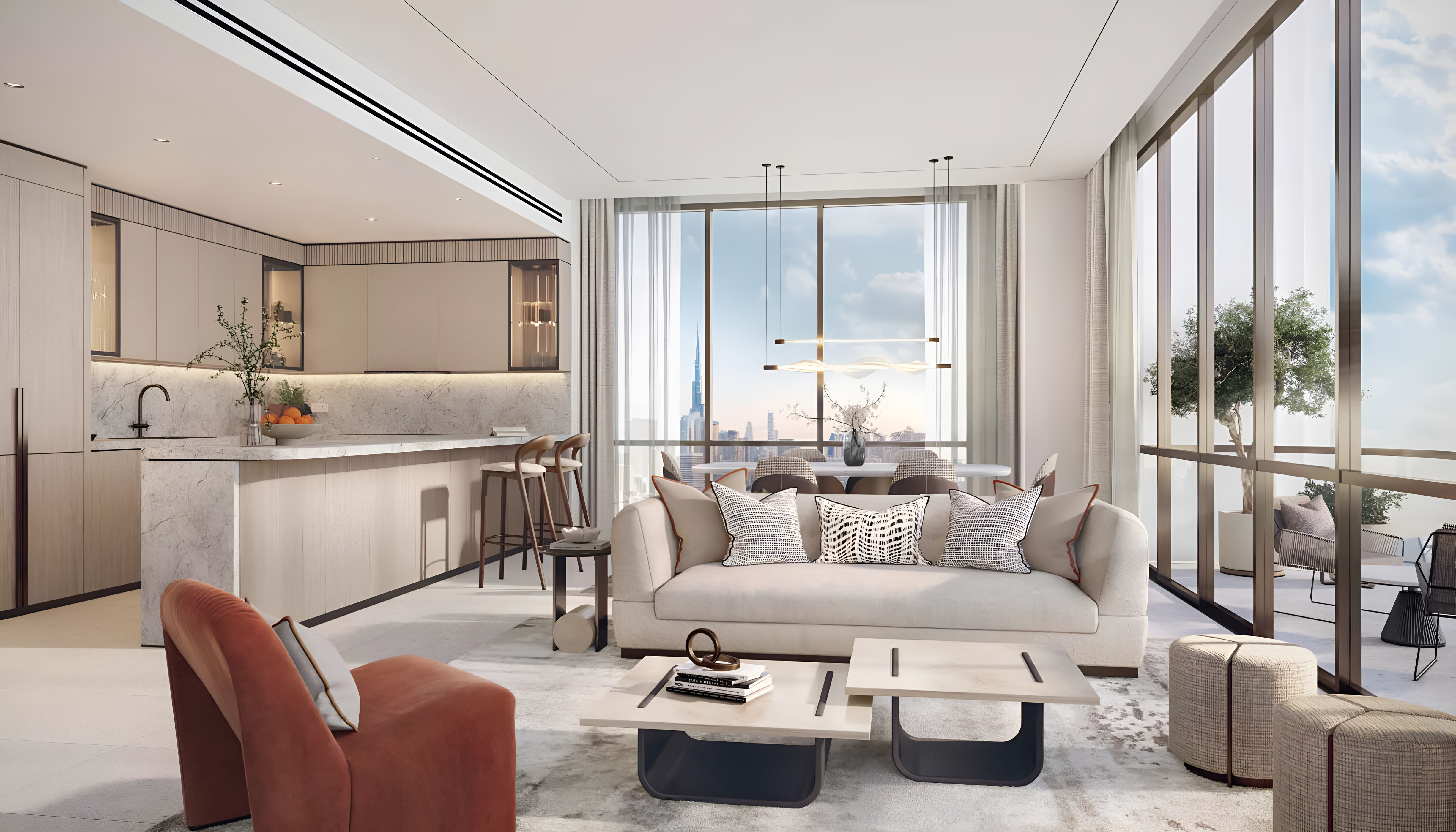 The residences at Atelis include a diverse collection of exquisitely designed homes: elegant 1 to 4-bedroom apartments, expansive 5-bedroom penthouses, and exclusive 4-bedroom waterfront villas. Each dwelling exemplifies luxurious living, featuring generous layouts, premium-grade finishes, floor-to-ceiling windows that welcome abundant natural light, advanced smart home technology, and expansive outdoor areas.