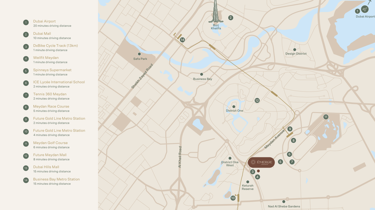 Nestled upon the highly coveted Meydan Avenue, this development secures a prime intersection of peaceful residential charm and dynamic urban access. Its strategic position offers immediate proximity to the world-renowned Meydan Racecourse and Grandstand, promising unparalleled leisure and entertainment opportunities. Residents will enjoy swift access to vibrant Downtown Dubai and the bustling Business Bay, while major thoroughfares ensure effortless commutes across the emirate. The surrounding locale presents a nurturing environment for families, featuring esteemed educational institutions, modern healthcare facilities, convenient retail precincts, diverse culinary experiences, and an abundance of landscaped parks and recreational areas.