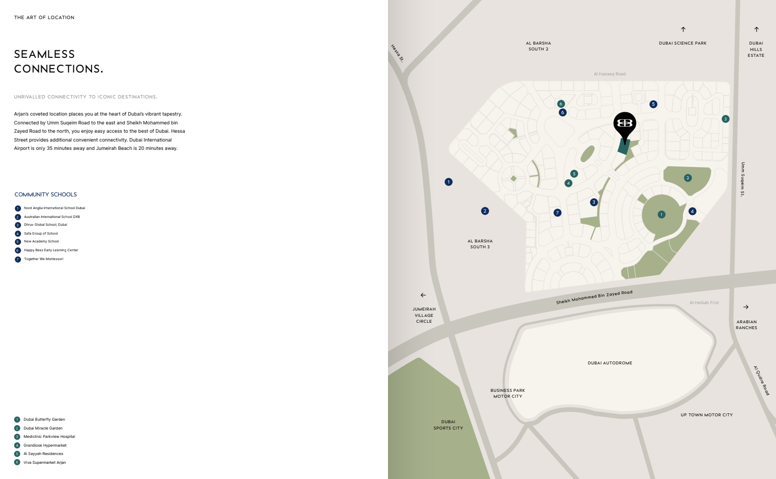 Strategically positioned within Arjan, the residences offer a perfect blend of peaceful living and immediate access to Dubai’s bustling core. Its advantageous placement ensures residents are never far from the city's celebrated attractions. Enjoy a quick 5-minute journey to the captivating Dubai Miracle Garden, or a brief 10-minute drive to the sophisticated Dubai Hills Mall. The world-renowned Mall of the Emirates is just 15 minutes away, while the vibrant Dubai Marina can be reached in approximately 20 minutes. For international travel, Dubai International Airport is conveniently located within a 30-minute radius, placing both leisure and business within effortless reach.