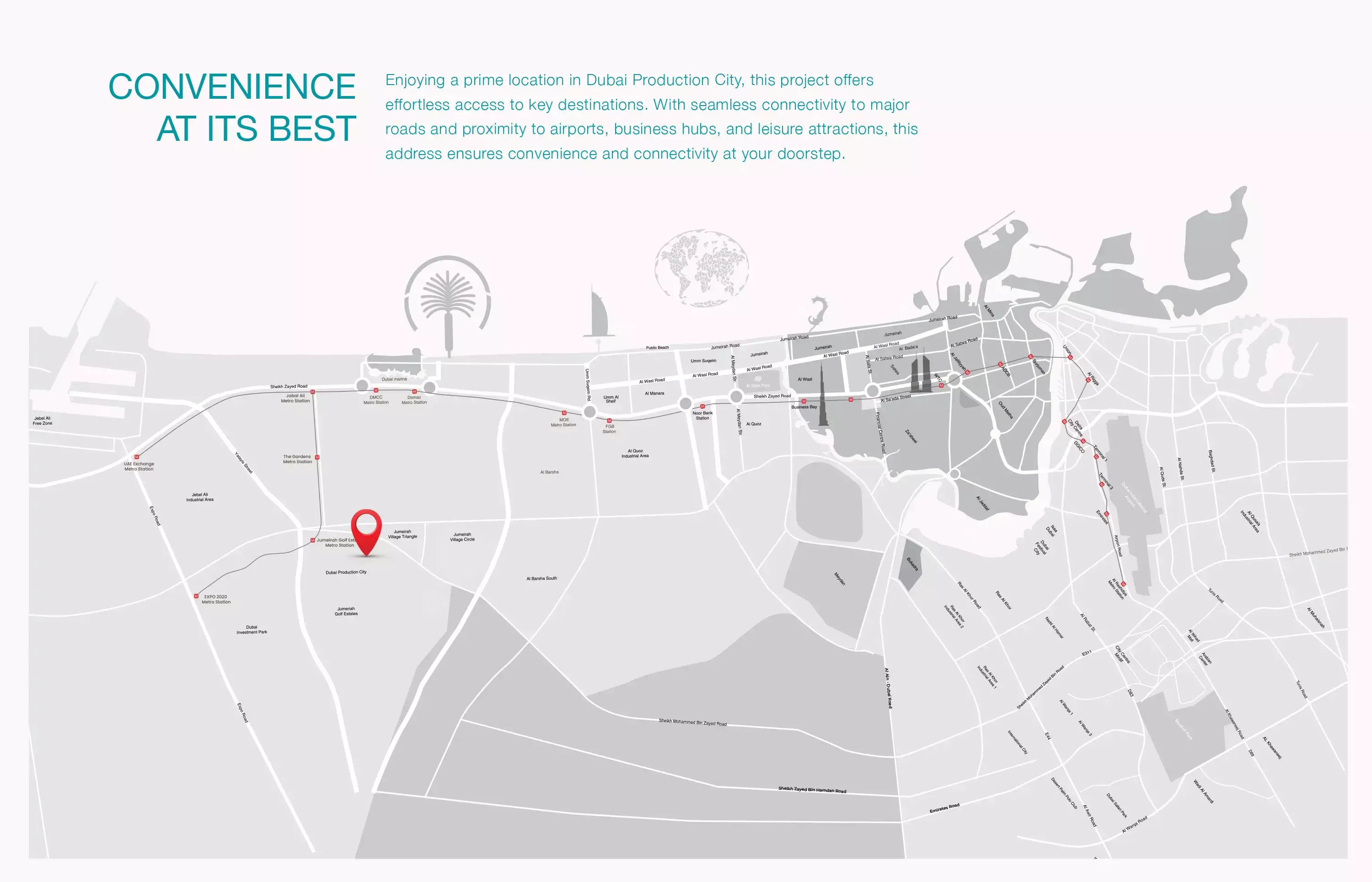 Strategically positioned in Dubai Production City, the development ensures residents enjoy seamless access to the emirate's most iconic destinations while providing a peaceful sanctuary from the city's hustle. Major landmarks are remarkably close: Dubai Marina is just a 15-minute journey, Downtown Dubai a swift 20 minutes, and Dubai International Airport can be reached in approximately 25 minutes. The world-renowned Palm Jumeirah is also conveniently accessible within 30 minutes, making it an ideal nexus for both daily commutes and leisure pursuits.