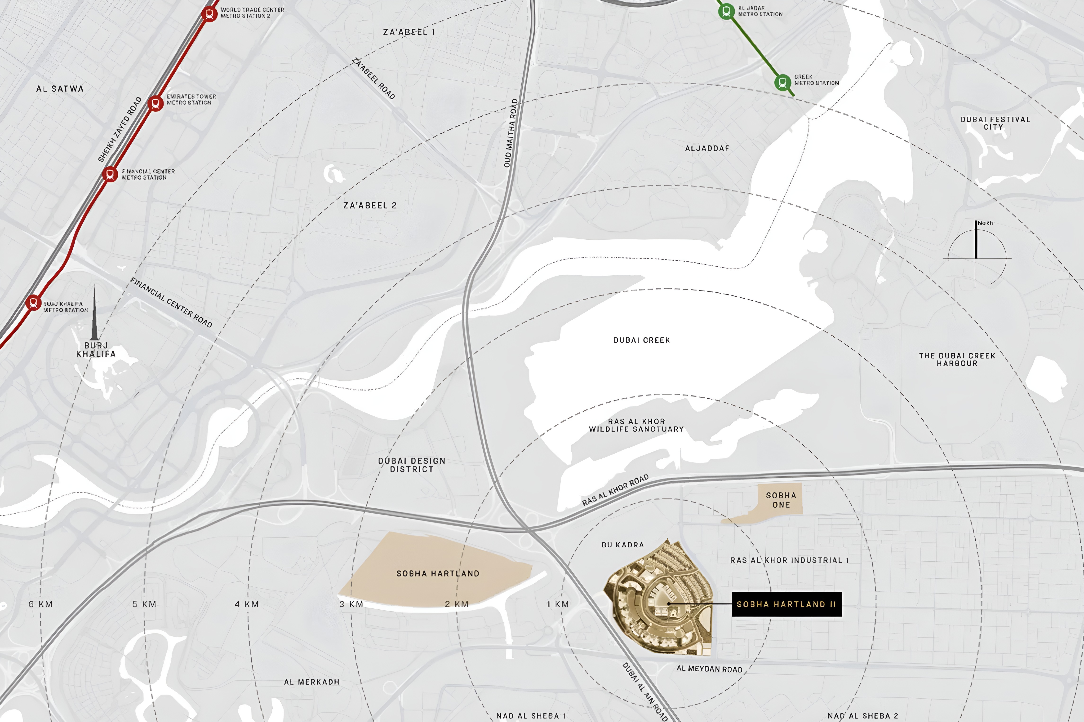 Situated in a prime location, residents will experience seamless connectivity to Dubai’s most vibrant districts. This strategic position places you just 2 kilometers from the historic charm of Dubai Creek and a mere 3 kilometers from the innovation hub of Design District. Future-proofed for effortless travel, the development benefits from close proximity to three major arterial roads and a proposed Metro station, ensuring swift access to any destination across the city.